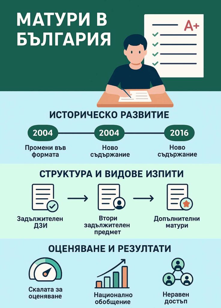 Системата на матурите преминава през няколко етапа: от по-локални и училищни оценки в миналото до централизирано национално организирани изпити. През 2004 г. беше приета основна наредба за организацията и провеждането на държавните зрелостни изпити, която впоследствие е изменяна и допълвана, но остава краеугълният нормативен документ за процеса. Тази трансформация отразява стремежа за повече обективност и по-добро съответствие между националните стандарти и реалната учебна практика. Lex