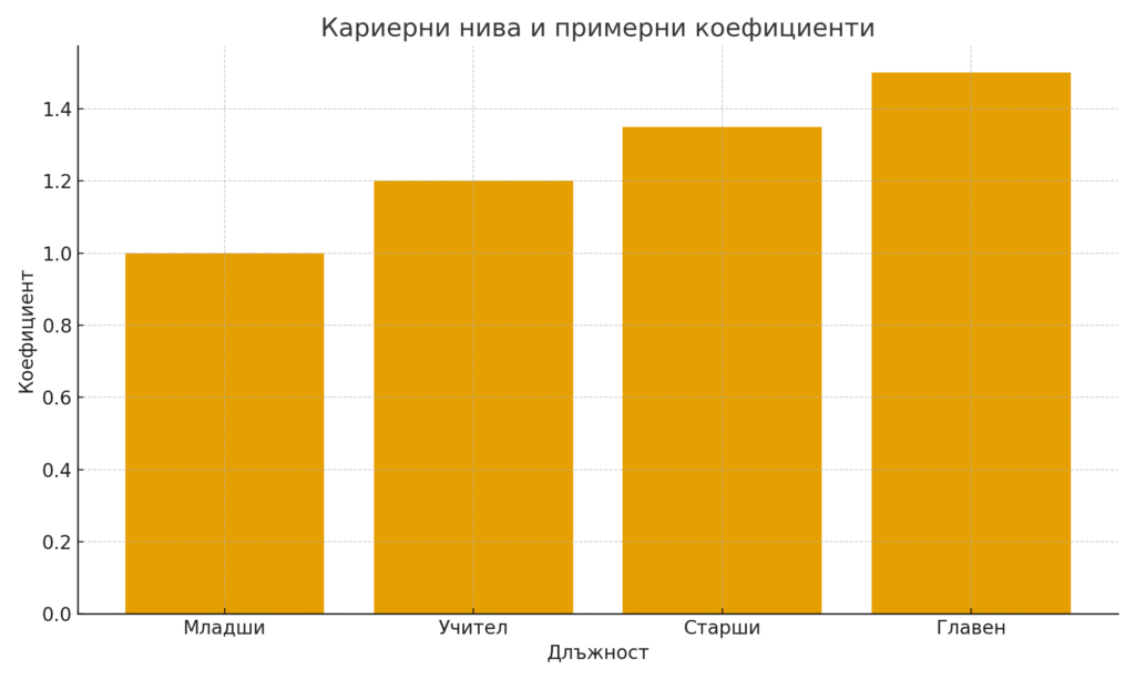 - Младши учител → Учител → Старши учител → Главен учител → Експерт / Директор.