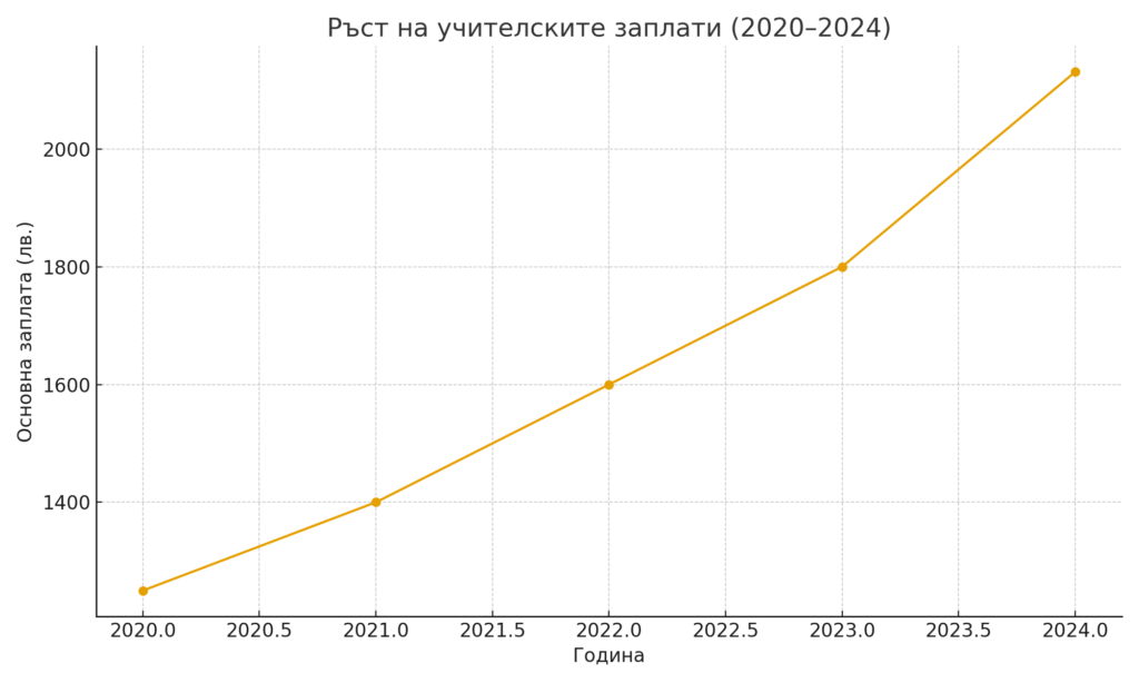 Иконография: Икона на монета/пари + графика на нарастване на заплати за учители през годините.